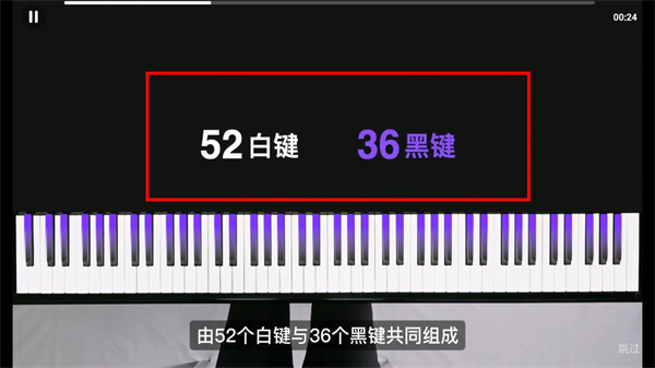 4、通过教学视频,学习钢琴有52白键和36黑键的知识。