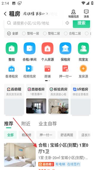2、在租房页面,选择心仪的房源进入该房源详情页面。