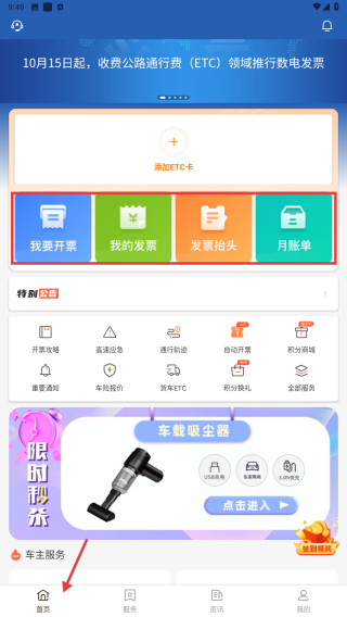 1、打开app,在首页当中有我要开票,我的发票,发票抬头,月账单等功能。