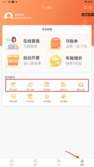 4、在我的页面可以查看积分签到,通行记录等功能。