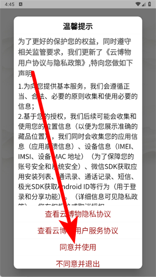 1、打开云博物馆,在弹出的温馨提示页,点击同意并使用,进入首页。