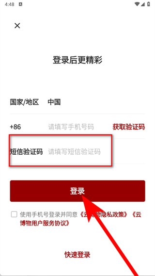 4、输入短信验证码,勾选同意相关协议后,点击登录,完成注册。