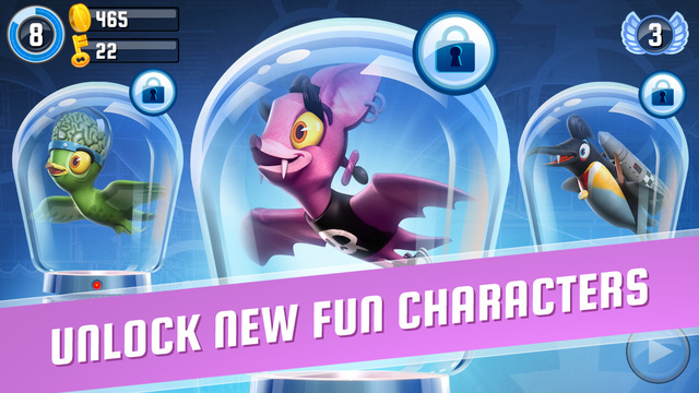 2、玩家要“指引”这些小鸟们,飞出这座实验牢笼。“指引”的方式很简单,玩家只需长按屏幕的指定区域,并根据小鸟的飞行方向挪动手指即可。不同的小鸟拥有不同的特殊技能,而且每只小鸟都有四种参数,分别是速度、能量、转向、磁铁。速度不用解释了,能量是指体力,转向则是敏捷度,而磁铁是小鸟的吸金能力。玩家可以通过闯关所获的金币,分别提升小鸟这四个参数。