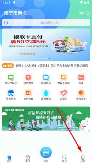 1、打开南宁市民卡app,点击底部导航栏的我的选项进入个人页面。