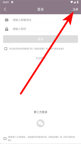 3、进入登录页面后,点击右上角的注册按钮,跳转到注册界面。