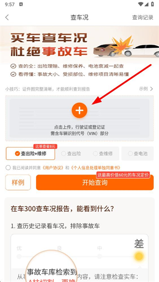 2、在查车况页面,点击加号图标上传行驶证或登记证,需含车辆识别代号VIN部分。