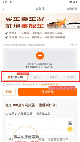 3、根据人格需求选择查询类型,如查出险+维修等。