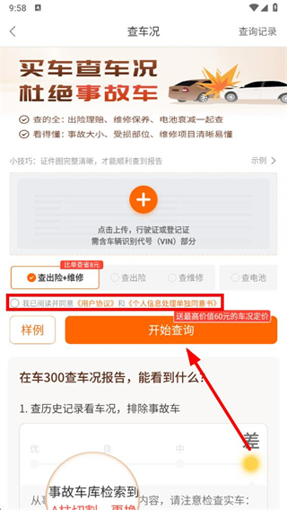 4、勾选同意协议后,点击开始查询按钮,即可查询历史车况信息。