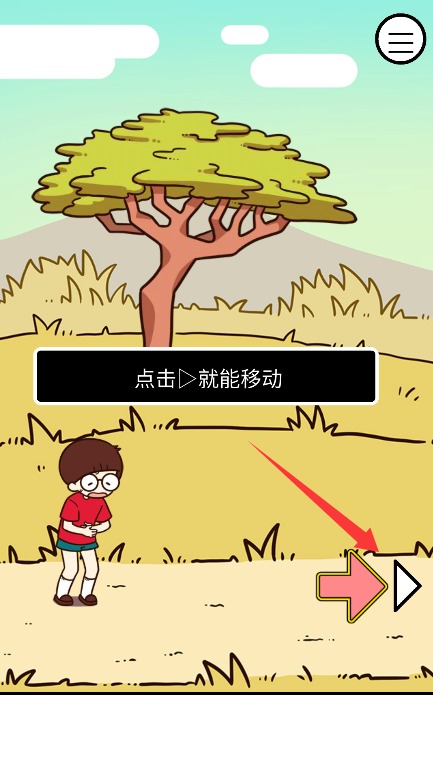 1、启动游戏后点击右侧前进按钮,控制少年在荒岛场景中逐步探索移动前行。