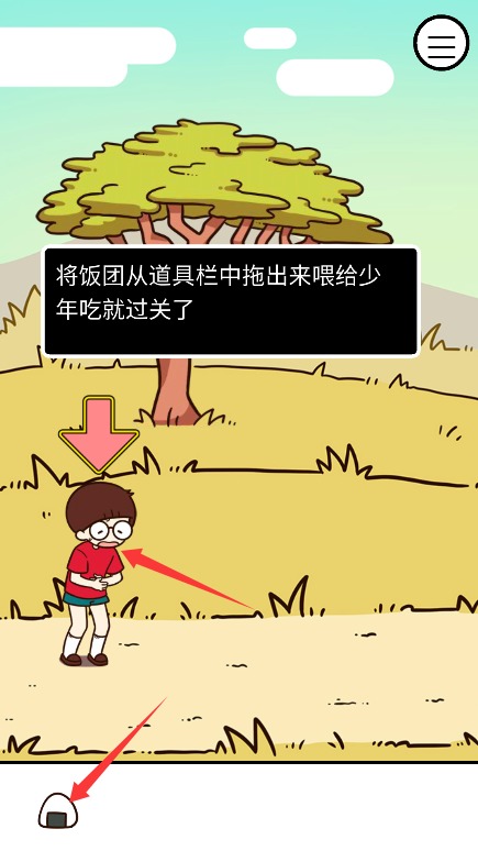 4、将饭团从道具栏拖拽至少年角色,完成喂食操作即可通过当前关卡挑战。