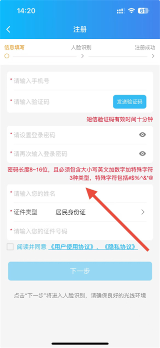 4、在注册页面中,依次输入手机号、验证码,设置密码,填写姓名、证件类型,点击下一步,完成人脸识别后即可注册成功。