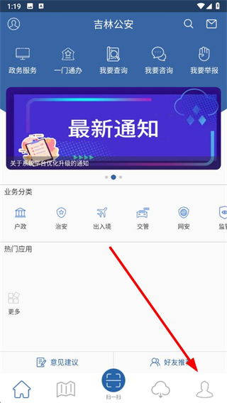 1、打开吉林公安app,点击底部导航栏的个人图标进入登录页面。