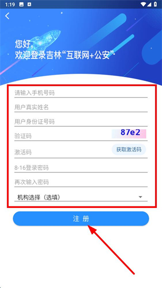 3、在注册页面中,依次在输入框内输入信息,选填机构后点击注册。