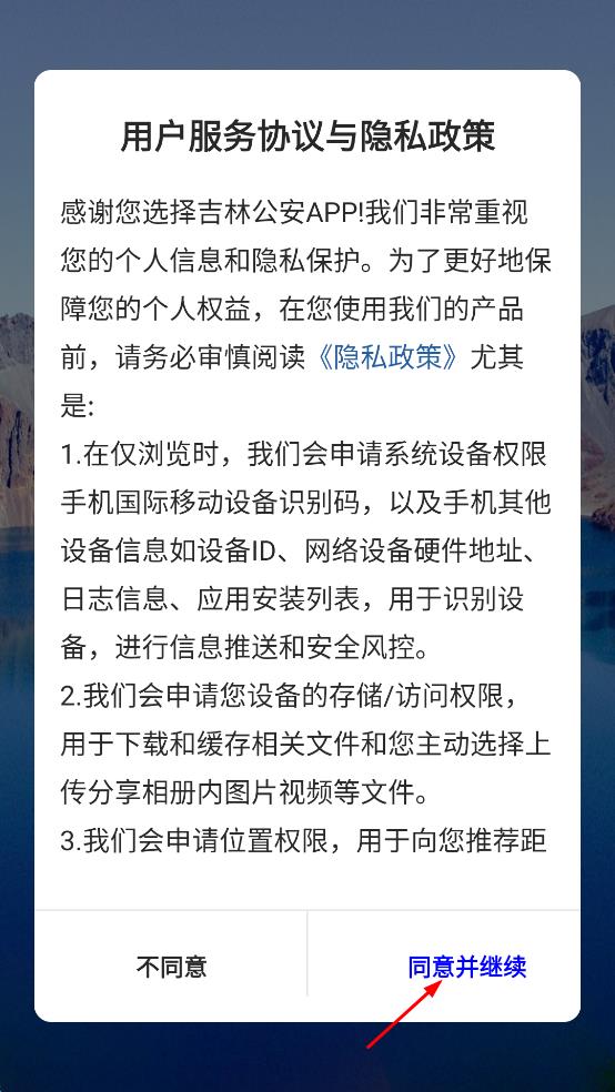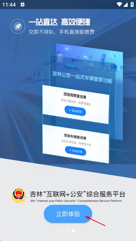 1、打开吉林公安APP,在弹出的用户服务协议与隐私政策页面,点击“同意并继续”,进入“一站直达高效便捷”界面后,点击“立即体验”。