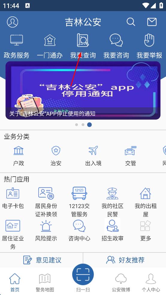 2、进入吉林公安APP主界面,在上方功能栏中找到“我要查询”选项,点击该选项。