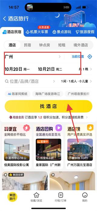 2、在酒店旅行页面,选择好信息后,点击找酒店,进入酒店列表页面。