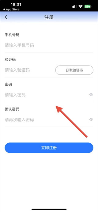 4、在注册页面中,依次输入手机号码、获取验证码,设置密码确认,点击立即注册完成账号注册。