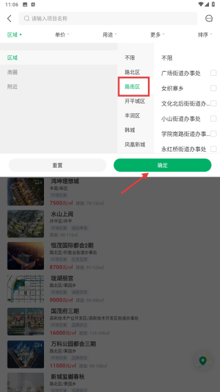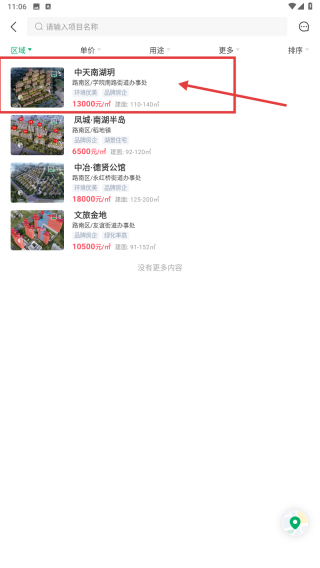 4、筛选完成后,查看路南区的新房列表,例如中天南湖玥项目,单价13000元/㎡,户型面积110-140㎡。