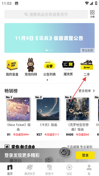 1、进入nice球鞋首页,点击二手,进入二手商品相关页面。