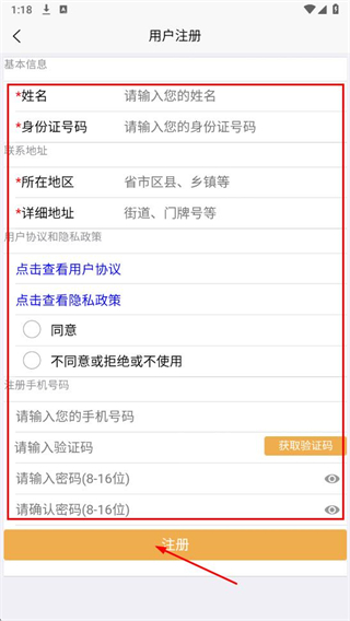 4、进入用户注册页面,填写信息,填写完成后点击注册。