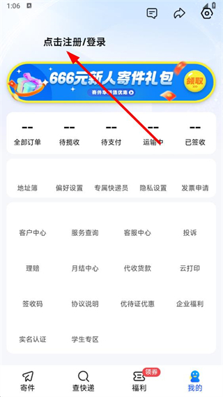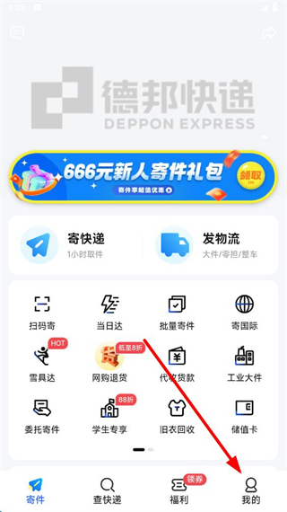1、打开德邦快递APP,在首页点击右下角我的选项。