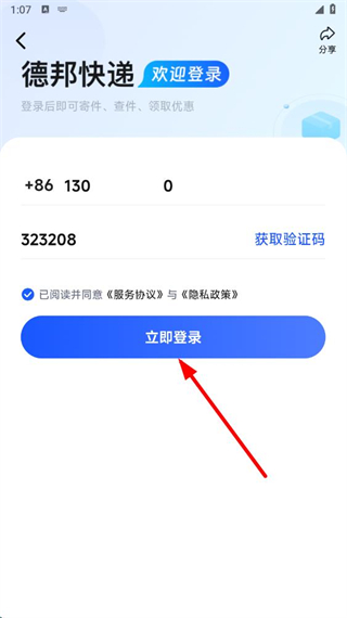 4、勾选已阅读并同意服务协议与隐私政策,点击立即登录按钮,若为新用户则自动完成注册并登录。