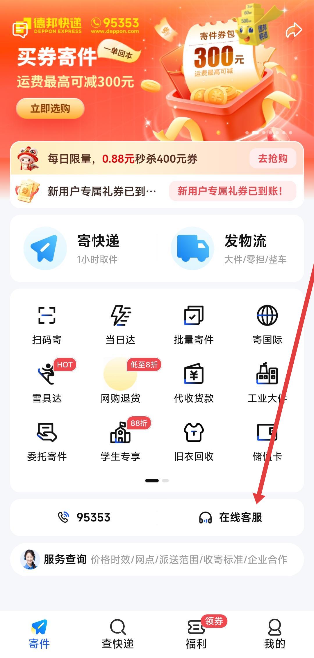 1、打开德邦快递APP,在首页下方找到并点击在线客服,进入客服咨询页面,开启查件的流程。