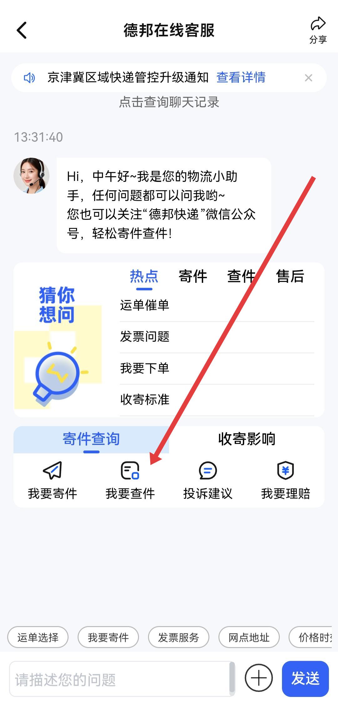 2、可以选择进入德邦在线客服界面后,在寄件查询板块中点击我要查件,获取查件相关指引。