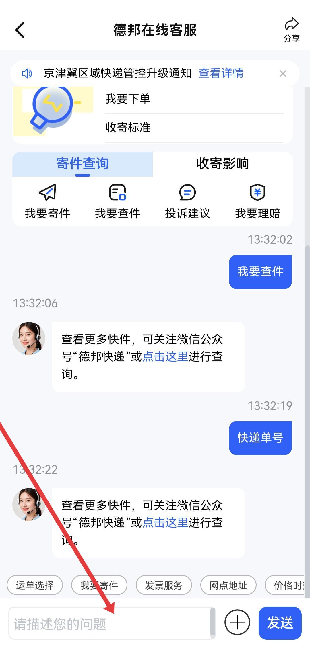 3、还可以在客服聊天界面的请描述您的问题输入框中,填写快递单号后点击发送,按提示完成单号查询。