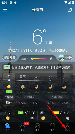 1、在长春市天气页面,点击底部我的,进入个人中心页面。