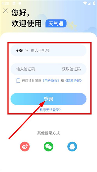3、在登录页面,输入手机号、验证码,点击登录,完成账号登录。