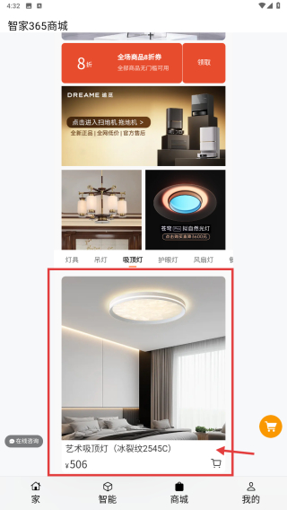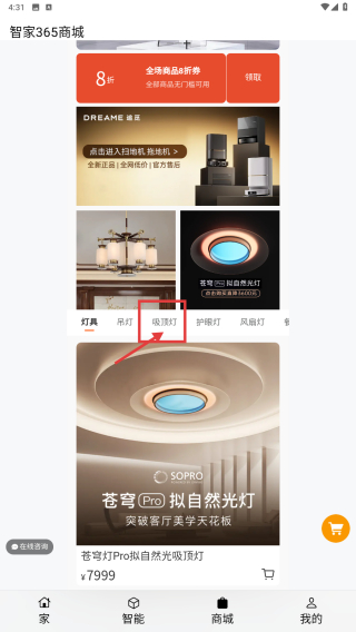 2、在商城页面,点击吸顶灯分类,进入吸顶灯商品列表。