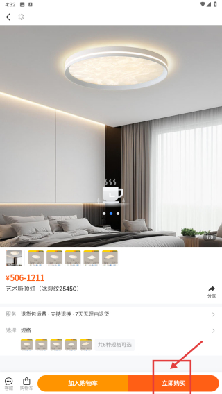 4、在商品详情页面,点击立即购买按钮,即可进行该吸顶灯的购买操作,该商品价格为¥506-1211,并有多种规格可选。