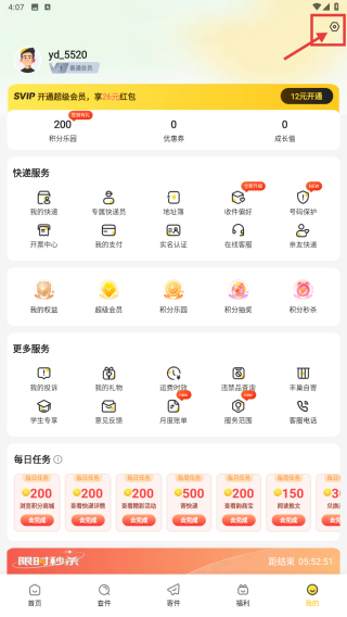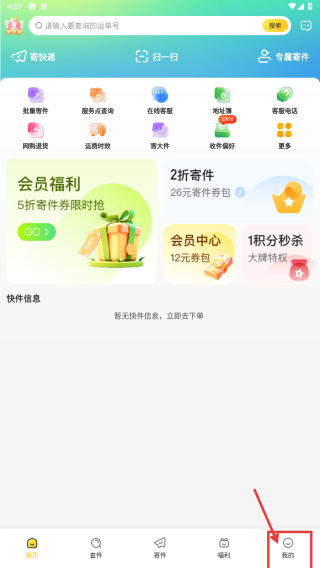 1、打开快递类应用,点击底部我的选项,进入个人中心页面。