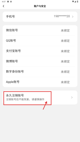 4、在账户与安全页面,点击永久注销账号选项,即可进行账号注销操作,需注意注销后账号不能恢复,请谨慎操作。