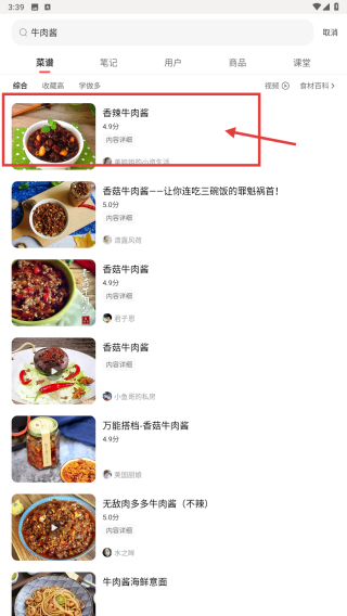 3、在牛肉酱内容列表中,选择香辣牛肉酱笔记,点击进入详情页面。