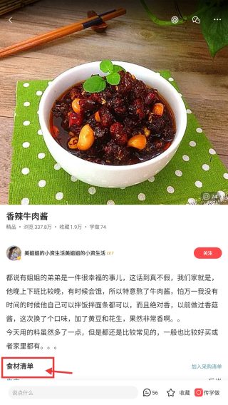 4、在笔记详情页面,查看食材清单,可获取制作香辣牛肉酱所需的食材信息,以便进行烹饪准备。