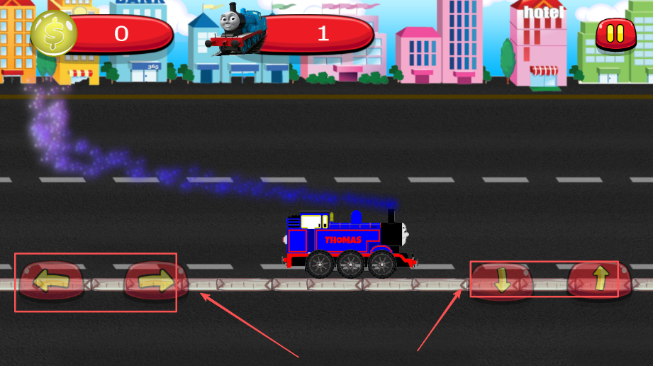 2、通过屏幕上的简易控制按钮调节小火车的行驶速度,在前进过程中需要灵活躲避轨道上的各种障碍物和危险区域。