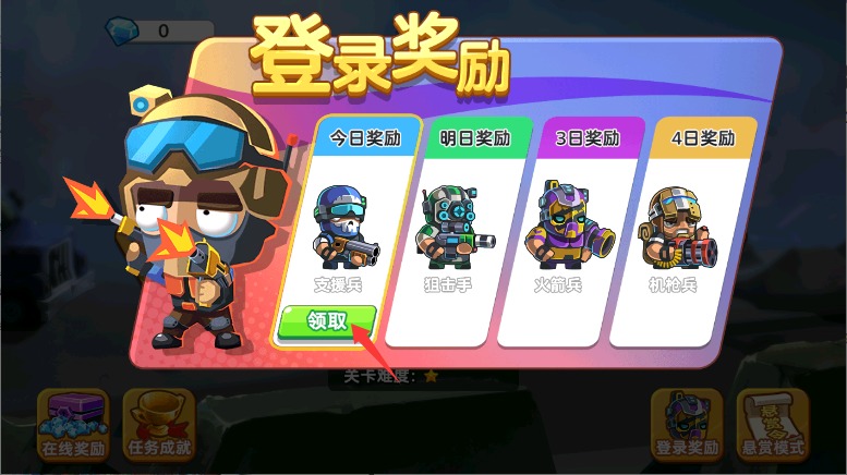 1、首次登录游戏会弹出签到奖励,记得领取系统赠送的英雄角色和基础装备礼包作为初始资源。
