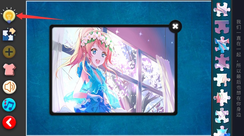 4、点击左上角参考图标的按钮可查看完整示例,通过对照细节完成拼图创作。