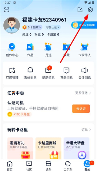 2、在个人页面点击右上角的设置图标,进入设置界面。