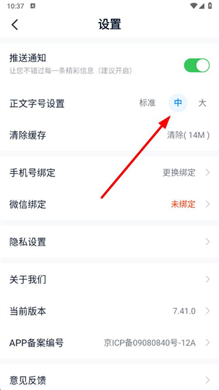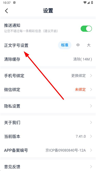 3、在设置界面找到正文字号设置选项,可看到有标准、中、大三种字号选择。
