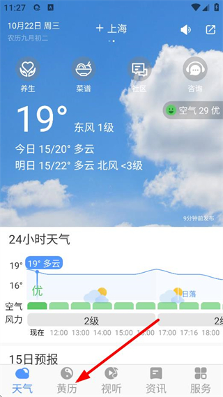 1、在APP主页面,点击底部的黄历,进入黄历页面。