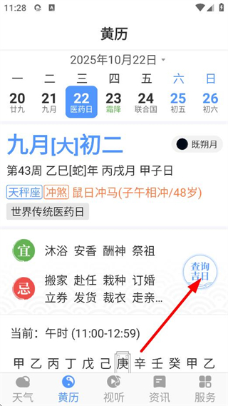 2、在黄历页面,点击查询吉日,进入吉日查询页面。
