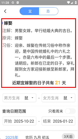 3、在吉日查询页面,可查看嫁娶相关的吉日注解、习俗及近期宜嫁娶的天数。