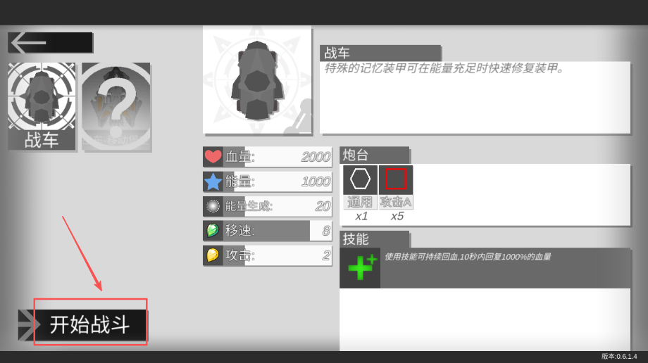 3、选好战车后,界面会出现开始战斗的按钮,找到这个按钮并点击,就能正式进入防御模式的战斗场景。