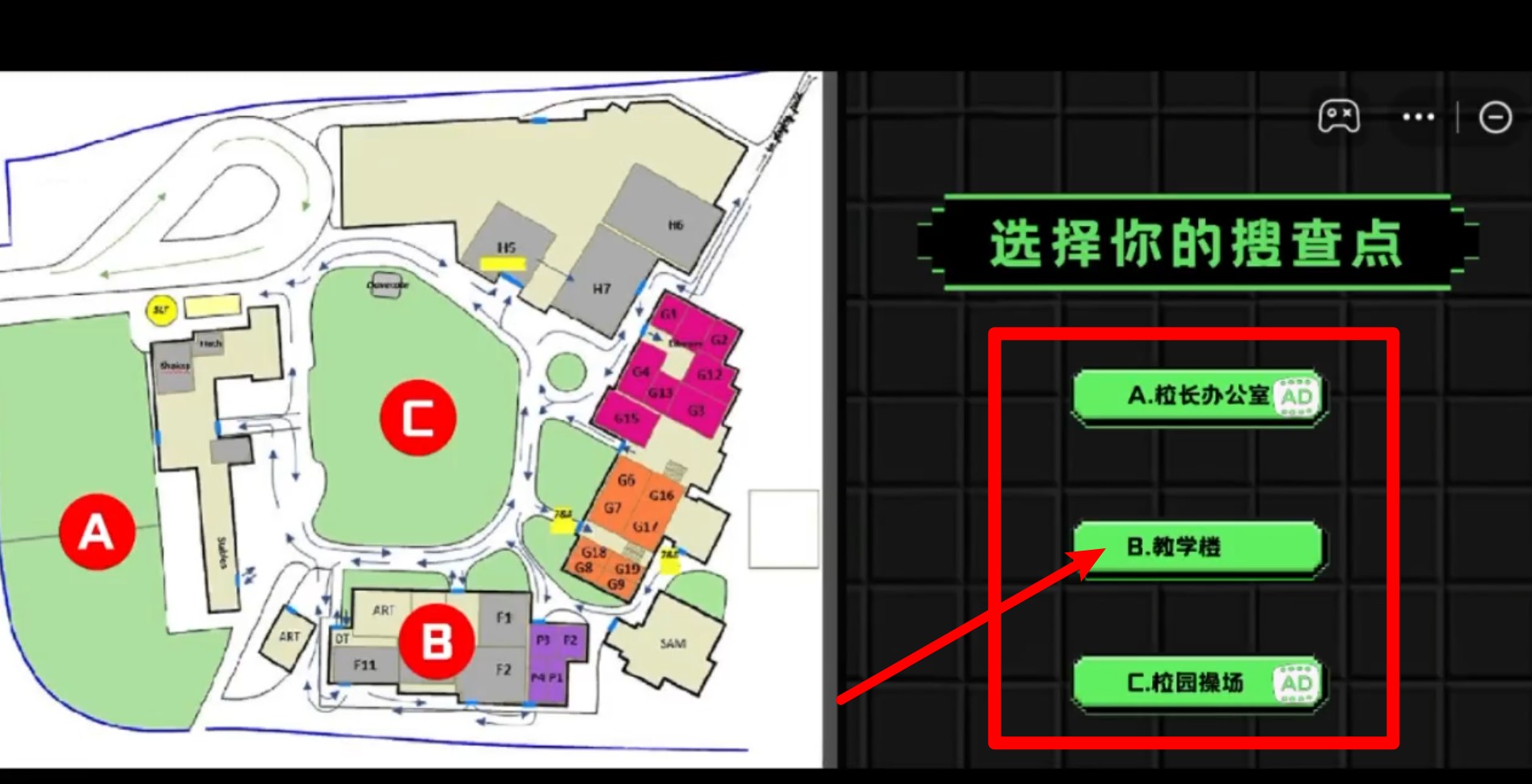 2.选择不同的搜查点会触发随机事件,点击教学楼进入后要仔细观察四周,可能隐藏关键物品或危险。