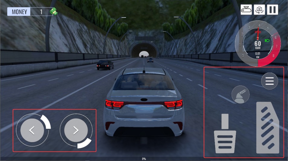 4、最后通过左侧虚拟按键控制车辆转向,右侧按钮则分别负责刹车、加速及手刹功能。
