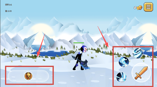 2、在游戏过程中根据屏幕方框内的虚拟按键进行移动、攻击和释放技能操作。