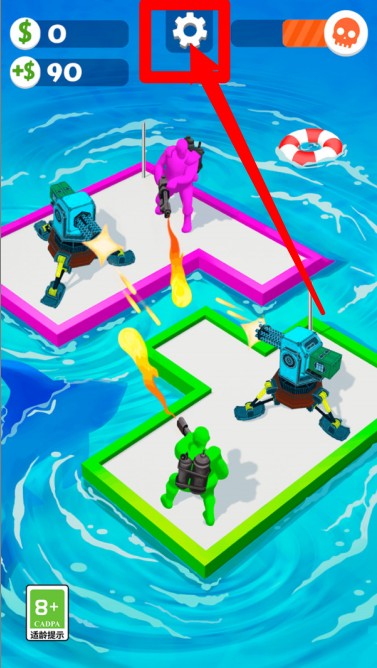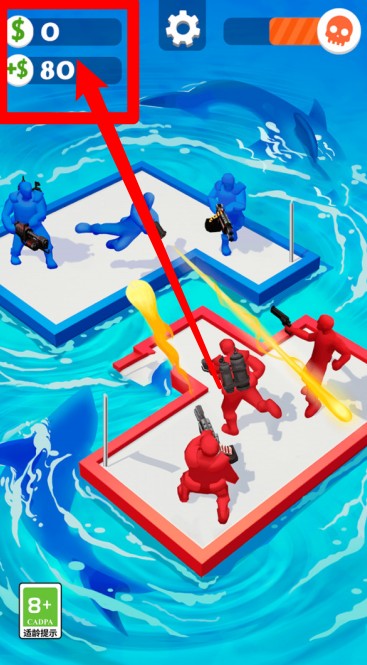 3.金币显示:左上角位置展示当前金币与收益情况,玩家可以随时查看资源数量,用于升级岛屿或强化武器装备。